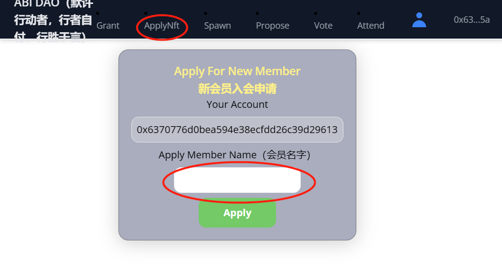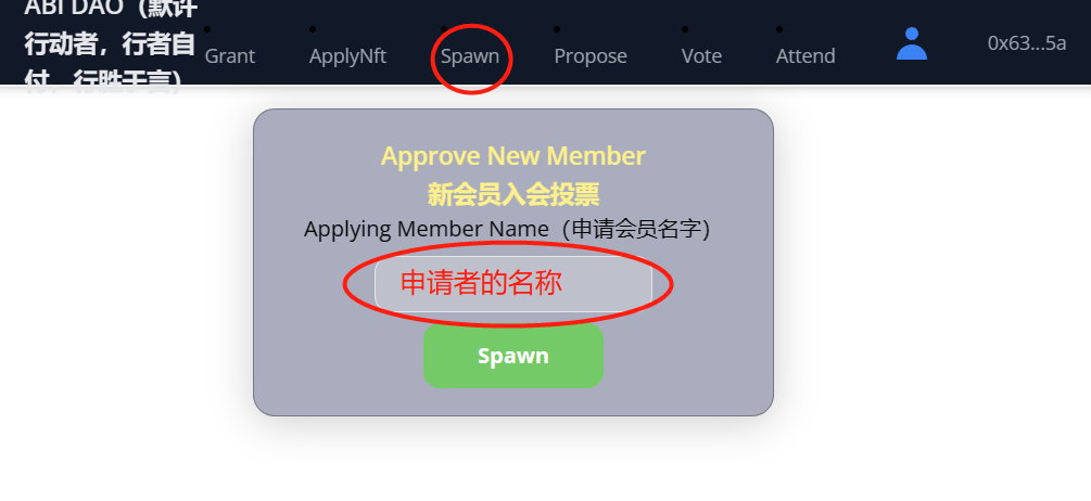 6. You will need to contact other members who have NFTs to vote on your membership application. Ask them to select the "Spawn" page, where if you have applied, your name will appear in a box (note: you cannot manually enter data, it depends entirely on whether your data is on the chain). Click "Spawn."